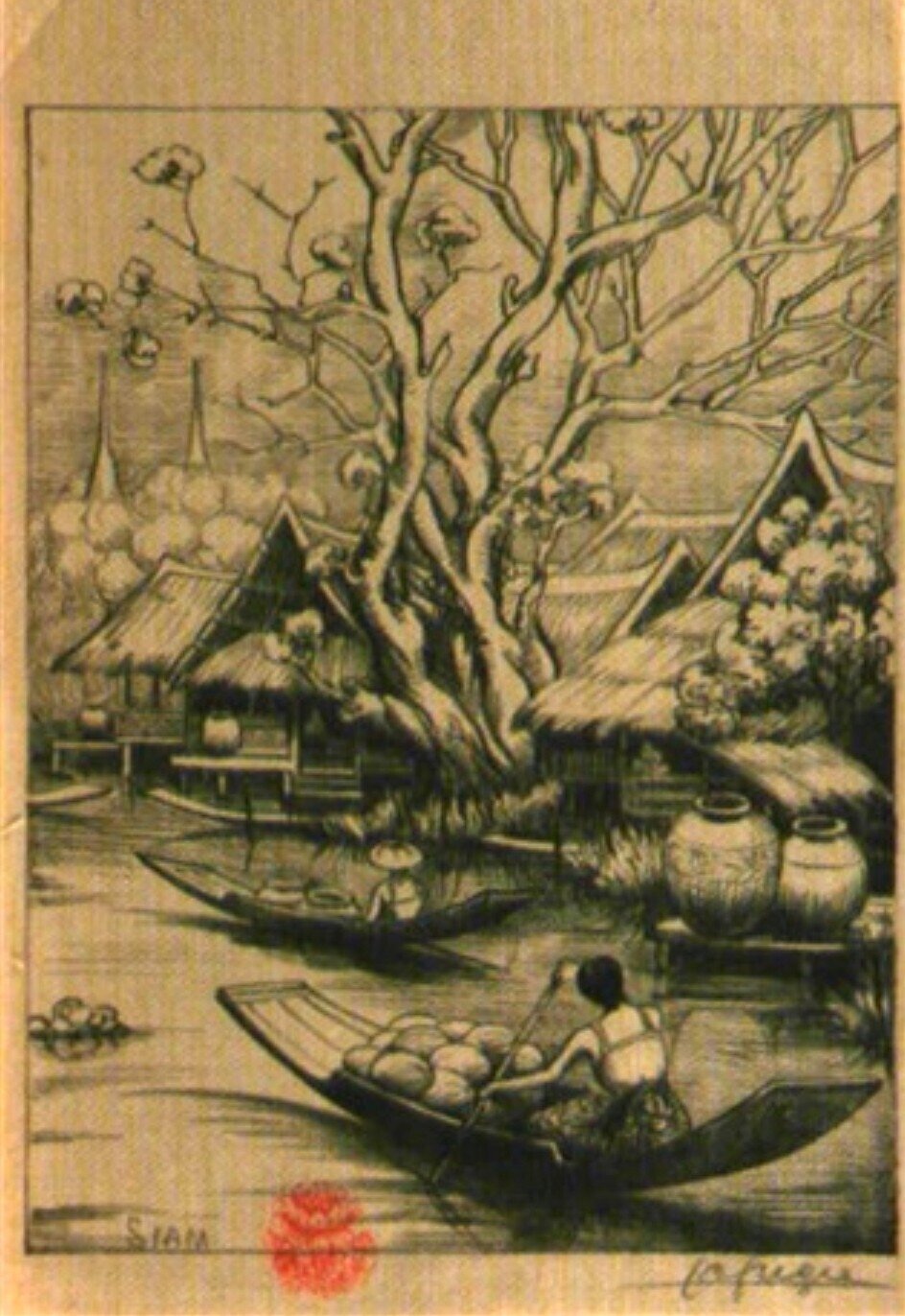 We know she lived in many of the places she pictured, especially in Siam and Malaysia, where her husband — she had married quite late, in 1931, at age 42 -, and spent continuous amounts of time in Phnom Penh, Shanghai, Saigon, Rangoon [Yangoon], Luang Prabang, Tokyo, or across Indonesia (1930), yet she was above all a “roving artist”, as reflected by the title of one of her numerous conferences on 15 Oct. 1932: “De la Birmanie au Mékong par la brousse siamoise par Mme Lafugie”[“From Burma to the Mekong through the srublands of Siamese”], as reported in the Parisian newspaper Excelsior on that day.