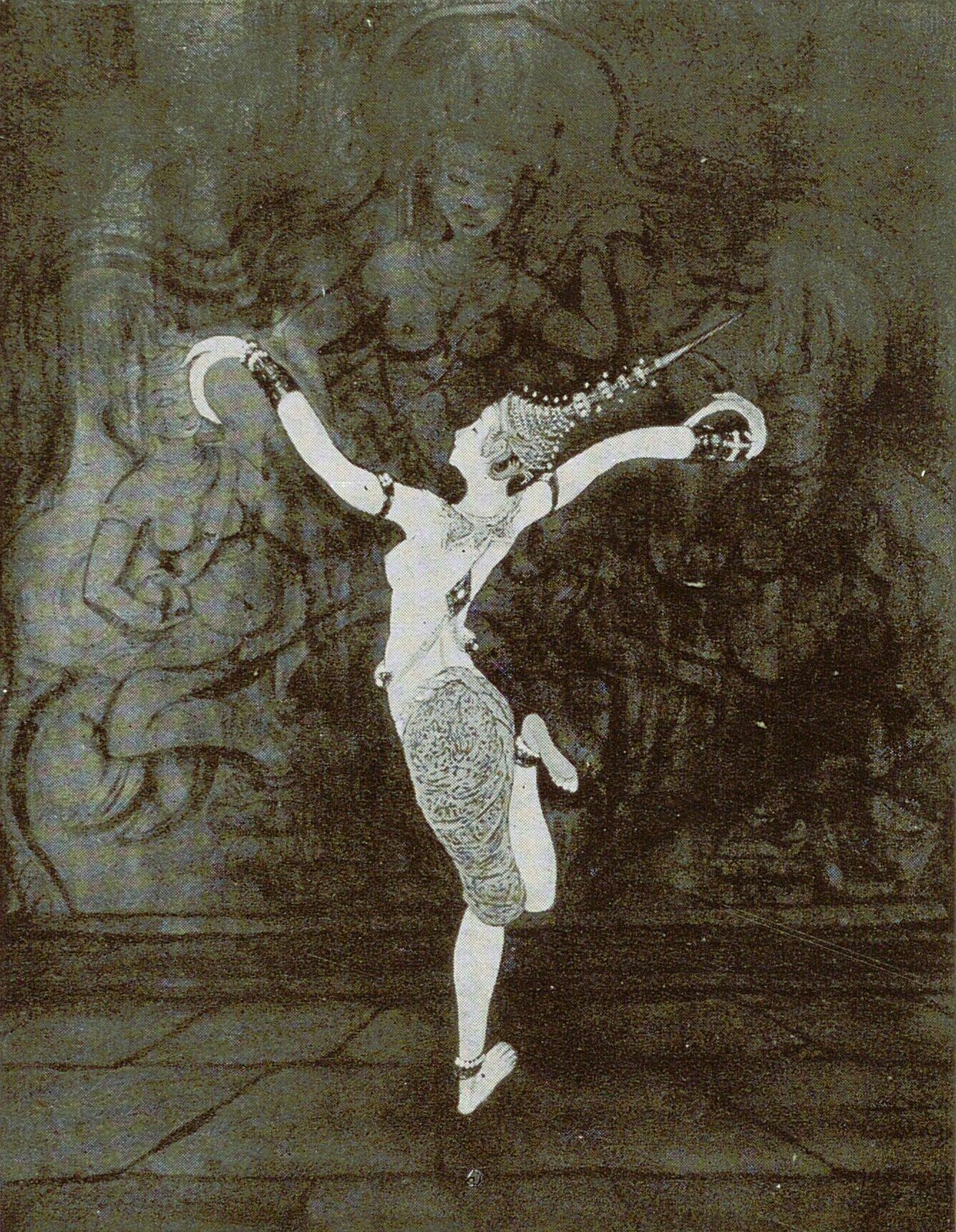 [In the evening, the great Hall of Honor at the Palace opens to European and Cambodian guests for the Royal Dances. The King wanted to inaugurate, for his coronation, a new corps de ballet for which the traditional costumes were made from the finest materials. Of the dancers of the previous reign, only the two first ballerinas remain, sovereigns of grace and science. Their supple and slow legs trace a poem of narrow measures on the ground; they dance, and the stone figures that watch over the temples of Angkor have come to life here. The expression of their dance is not in the body which, massive, composes the motionless and colorful landscape; it is not in the face which is the haughty spectator. But the arms sculpt the design and, as tireless companions, the feet, which no one looks at, have the most eloquent role. Their changing grace unfolds the action. Like jellyfish clinging to the water that rocks them, they stick to the cold marble to bloom again into living petals. Let the eyes focus on them alone and their multiple and learned play will express the value of the entire dance, the fullness of the limbs and the curves of their movements. To see them act like two beings independent of the life they support, untying their fingers, arching their soles in a delicate arc or crawling like twin serpents and always putting into their gait the sum of the cadence, these frail limbs which have glory only in nudity, reveal their secret, their intelligent perfection. The whole dance is concentrated in them, as the ballet is summed up in the undulating and youthful majesty of the first dancer.]
