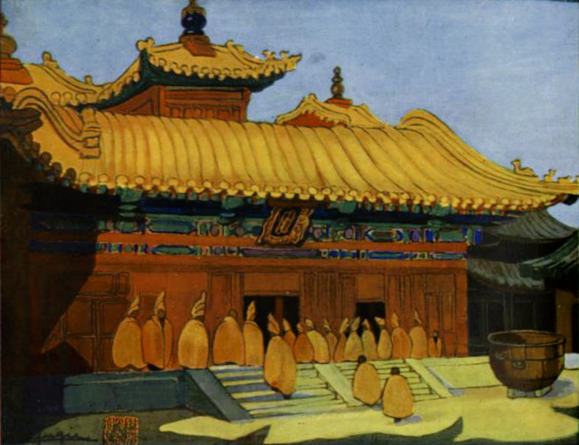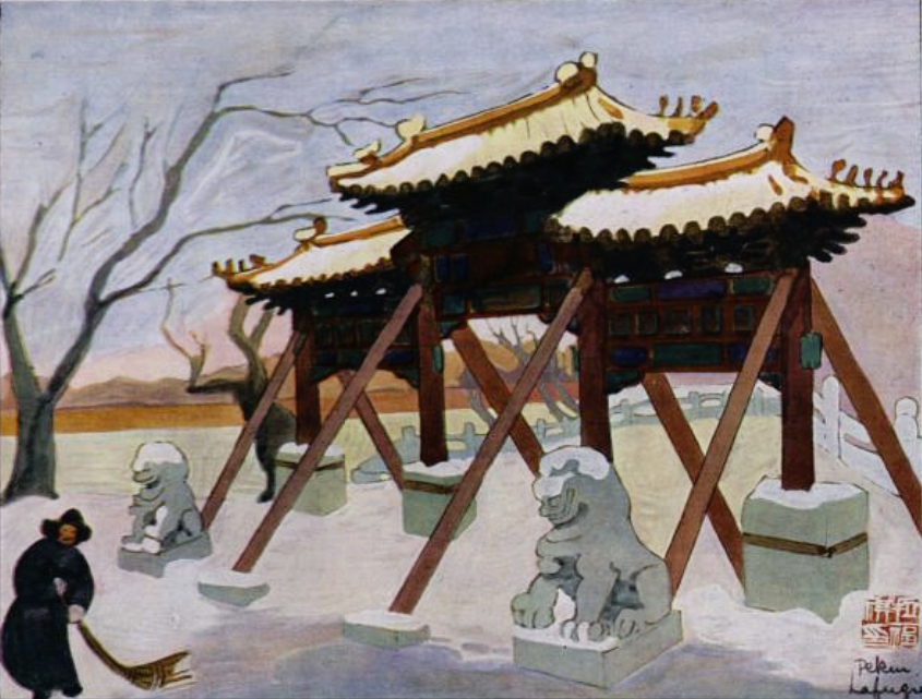 In Tibet arose her interest in Buddhist monastic life, an aspect of Asian culture she would look into again in Japan, being accepted to a retreat at Mount Koya [jp 高野山 Kōyasan], the spiritual center of Shingon Buddhism, an important Buddhist sect which was introduced to Japan in 805 by Kobo Daishi. Yet more than a spiritual quest what seems to have fascinated the artist was the way religious practices might protect social and personal life from the standardization of mercantile modernity. In China, her numerous street views and daily life scenes were aimed at showing the ‘Old China’, not in its feudalistic and despotic aspects but the spiritual realm in which people interacted, ate, played. Painting an elaborate gateway in a snowed field with the Beijing walls in the far background [LL-CH-12], she carefully noted in 1931 on her composition it was a “Pei Lou” gate, alluding to the Pailou or Paifang [ch牌坊], gateway to an enclosure corresponding to an Ancient China administrative subdivision.