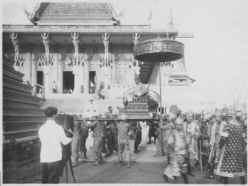 “The King seats on his palanquin to tour the city” [photo ‘Protectorate of Cambodia’ in Revue indochinoise, Sept. 1928, op. cit.]