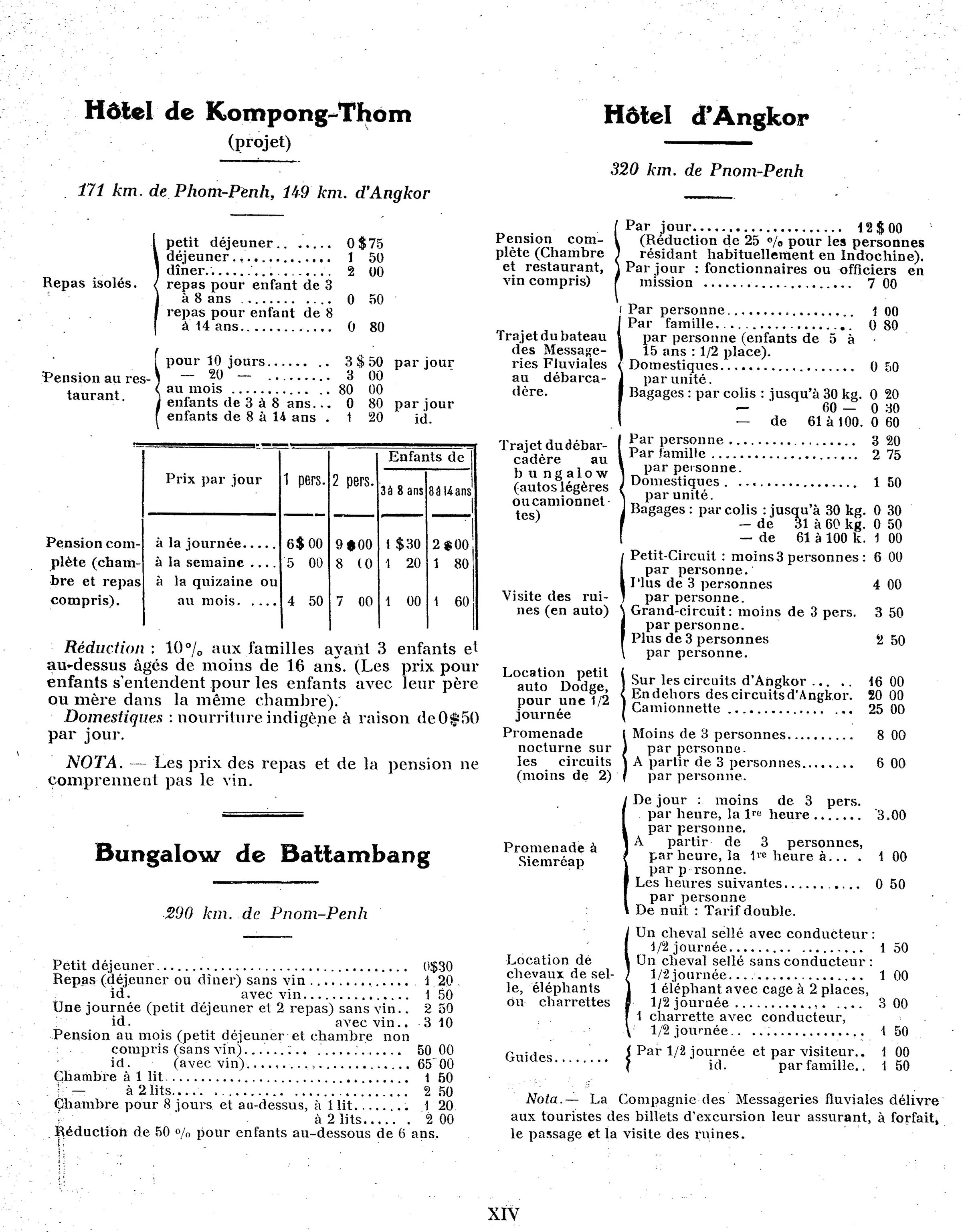 Complete Excursions, Ruins of Angkor, a bilingual brochure issued by the French Syndicat d’Initiative de l’Indochine-Tourist Office in 1923 witlh several tour options from Saigon, all including a stay at Sala Hotel Angkor with a fixed rate of $12 per day/night.