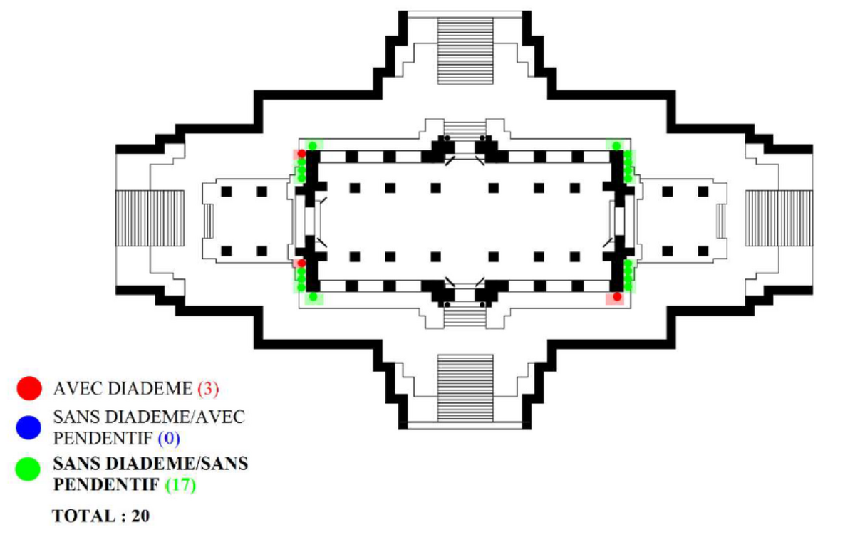 Here, the author adds another distinction between apsaras with or without the distinctive, round pendant so characteristic of Angkorian art. Also, the spatial distribution of ornamented figures seems to follow a strict rule: in the innermost sanctuary, the 62 apsaras are all wearing a tiara, except one devoid of any kind of ornament.