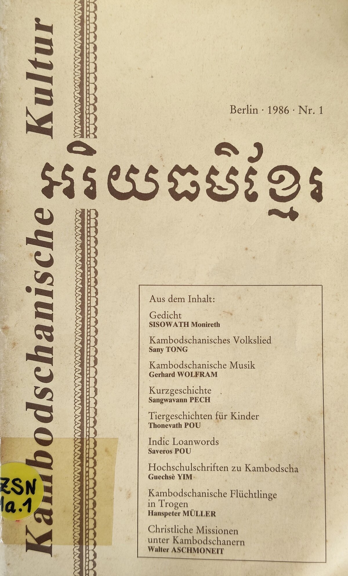 Berlin, 1981 (1) | ISSN 0179 – 2695 | Redaktion für Heft 1 [Editorial Committee for N. 1]: Walter Aschmoneit, Arifine Math Ly Haroun, Thonevath Pou, Guechsè Yim | Umschlagentwurf [Cover design] : Thonevath Pou, Manfred Dloczik, Walter Aschmoneit | Copyright: Studiengemeinschaft Kambodschanische Kultur e.V.