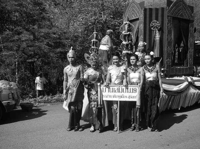 Figure 11.2 Ethnic Khmer posed in front of an ancient Khmer sanctuary float at Phnom Khaw Saway Festival, Surin Province (Photo A. Denes). [ADB: Phnom Khao Sway or Phanom Khaw Saway Forest Park วนอุทยานพนมสวาย is an important pilgrimage and excursion site near Na Bua in Mueang Surin District, Surin District].