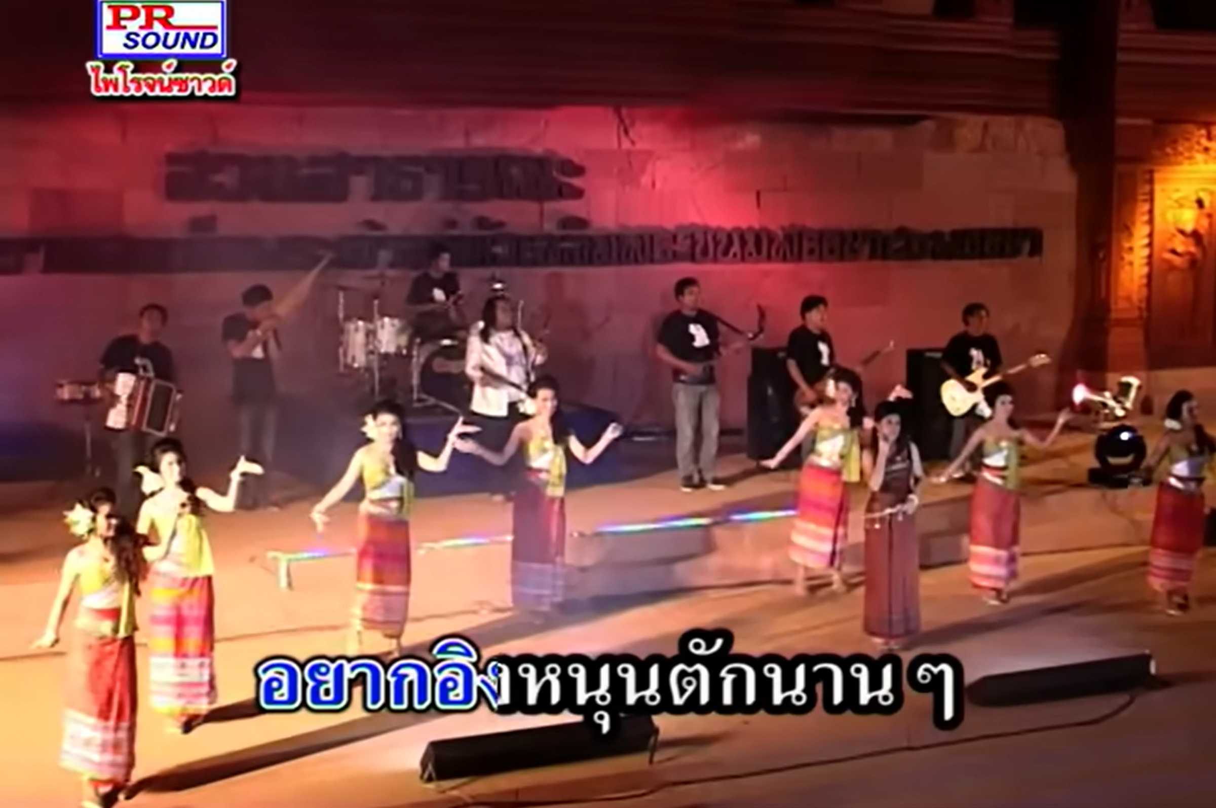 Kantrum [kh កន្រ្ទឹម th กันตรึม], a popular musical genre that originated within the Khmer community of Southern Isan, has lyrics in Khmer but the video clips, distributed by channels such as PR Sound Khmer Surin, usually come with Thai subtitltes. Some musicologists have claimed that the musical genre is the closest to what music in Ancient Angkor might have been. Listen to this song by Khmer female singer Jen Saijai [kh ចេនសាយចៃ th เจน สายใจ].[screenshot from YouTube clip, 2018.]