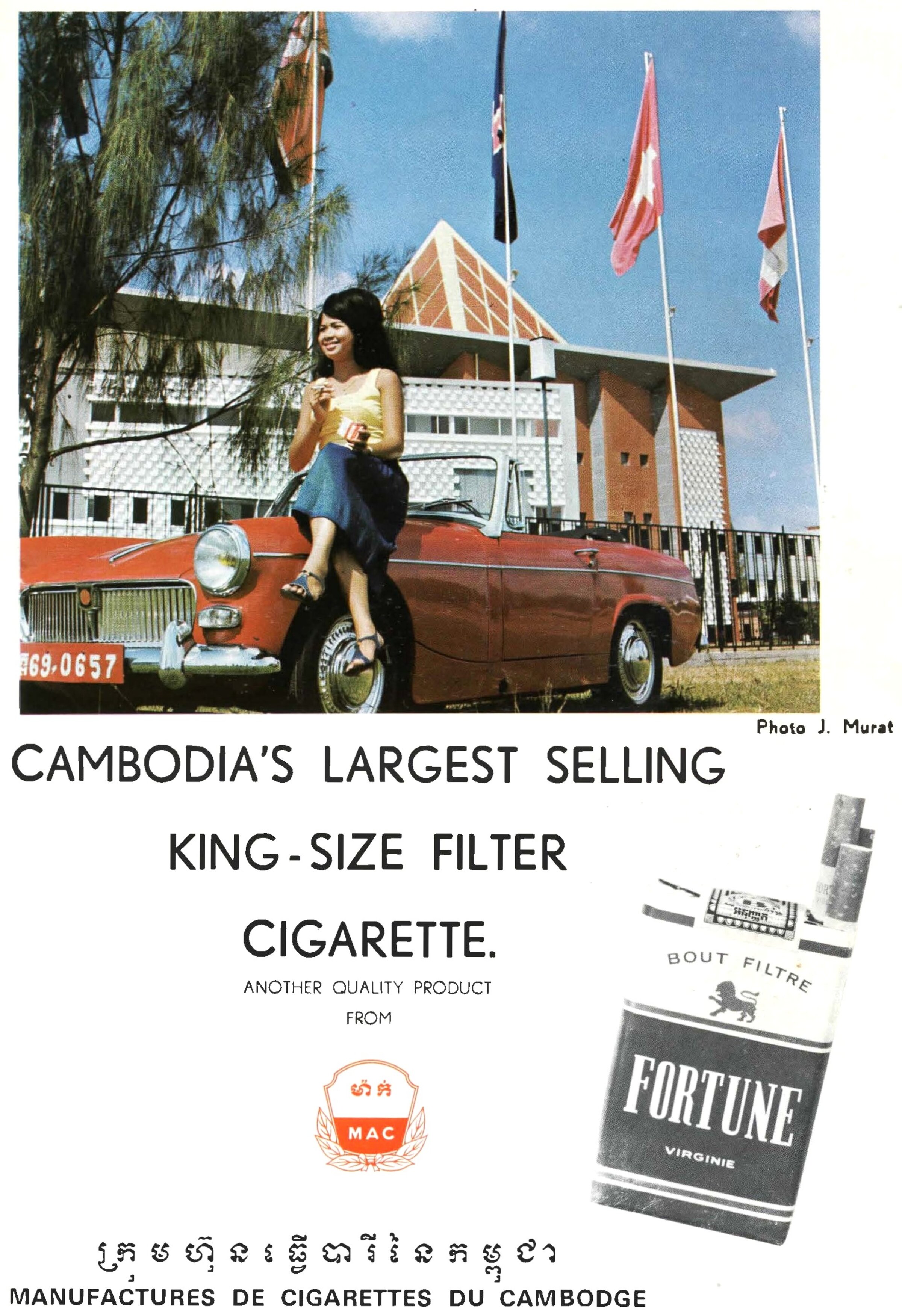The Suramarit Theater in its ektachrome glory in this ad for Fortune cigarettes (from Nokor Khmer magazine, April 1970, photo by J. Murat.]